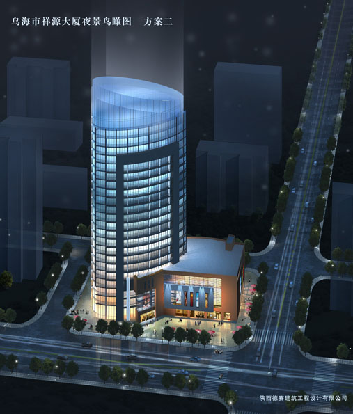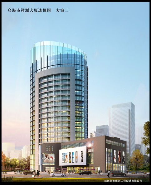 祥源大廈位于內(nèi)蒙古烏海市,由于烏海位于沙漠邊緣,基本沒有農(nóng)業(yè)產(chǎn)業(yè),是一個礦產(chǎn)及工業(yè)性的城市,為了打破城市原有的、單一的城市風貌,平面布局設(shè)計為一個橢圓形的塔樓,并在立面設(shè)計時采用大面積的玻璃幕墻,最大限度的采光并提升城市品味。